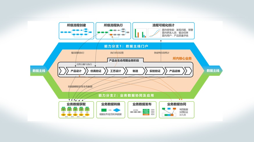 PERA DT iThread 結(jié)合企業(yè)業(yè)務(wù)建立一套包含數(shù)據(jù)及模型匯集、審核、發(fā)布、查看的數(shù)字主線平臺,利用該平臺在產(chǎn)品全生命周期設(shè)計、制造、維保等過程中,對各級系統(tǒng)、子系統(tǒng)、設(shè)備的模型、指標(biāo)數(shù)據(jù)、工藝數(shù)據(jù)、制造數(shù)據(jù)、維保數(shù)據(jù)等進(jìn)行統(tǒng)一管理。同時提供兩種能力為業(yè)務(wù)過程進(jìn)行服務(wù),一種是數(shù)據(jù)主線門戶能力,另一種是業(yè)務(wù)數(shù)據(jù)協(xié)同及應(yīng)用能力。數(shù)據(jù)主線門戶承載著企業(yè)級業(yè)務(wù)流程的驅(qū)動職責(zé),為現(xiàn)有的核心業(yè)務(wù)過程提供更“宏觀”的指導(dǎo)與監(jiān)控,采用企業(yè)級業(yè)務(wù)流程的方式實現(xiàn)業(yè)務(wù)的驅(qū)動。業(yè)務(wù)數(shù)據(jù)協(xié)同及應(yīng)用能力提供業(yè)務(wù)數(shù)據(jù)規(guī)范化模板配置、業(yè)務(wù)數(shù)據(jù)獲取、轉(zhuǎn)換及發(fā)布,支持不同業(yè)務(wù)階段以規(guī)范的數(shù)據(jù)接口共享協(xié)同數(shù)據(jù)。PERA DT iThread為復(fù)雜產(chǎn)品和系統(tǒng)研發(fā)過程中各專業(yè)之間、以及客戶與研制方之間的信息共享和協(xié)同提供了全新的解決方案,成為復(fù)雜產(chǎn)品和系統(tǒng)研制的跨業(yè)務(wù)、跨組織、跨地域協(xié)同工作的“經(jīng)絡(luò)系統(tǒng)”。